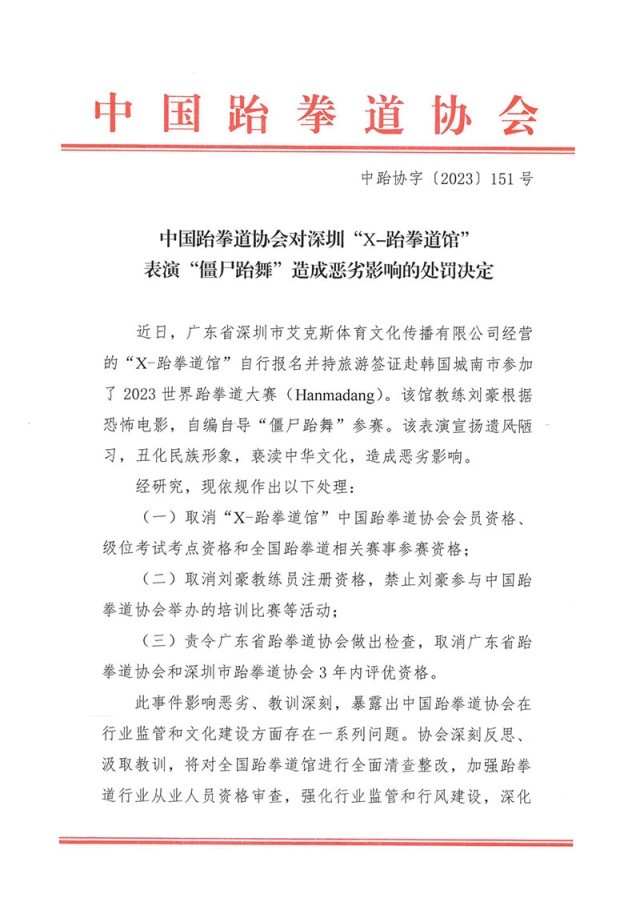 央視網(wǎng)消息:8月21日,中國(guó)跆拳道協(xié)會(huì)官網(wǎng)發(fā)布對(duì)深圳“X-跆拳道館”表演“僵尸跆舞”造成惡劣影響的處罰決定。