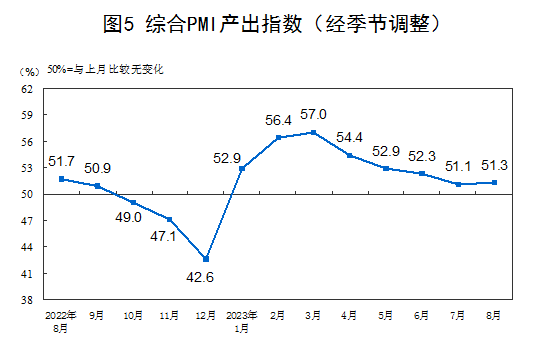 8月份,綜合PMI產(chǎn)出指數(shù)為51.3%,比上月上升0.2個百分點,繼續(xù)保持在擴張區(qū)間,表明我國企業(yè)生產(chǎn)經(jīng)營活動總體穩(wěn)定擴張。