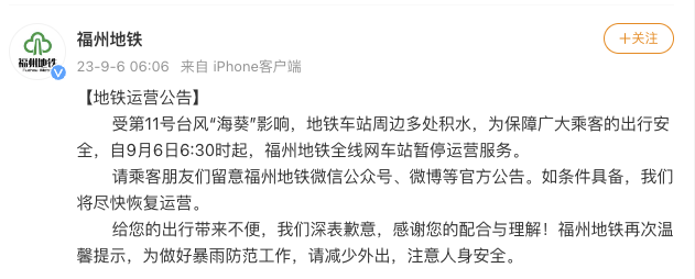 央視網(wǎng)消息:據(jù)@福州地鐵 微博消息,受第11號臺風(fēng)“海葵”影響,地鐵車站周邊多處積水,為保障廣大乘客的出行安全,自9月6日6:30時起,福州地鐵全線網(wǎng)車站暫停運營服務(wù)。如條件具備,將盡快恢復(fù)運營。