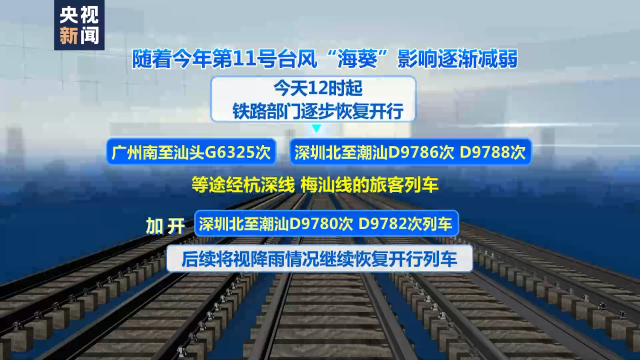 隨著今年第11號臺風“??庇绊懼饾u減弱,5日12時起,鐵路部門逐步恢復開行廣州南至汕頭G6325次、深圳北至潮汕D9786次、D9788次等途經(jīng)杭深線、梅汕線的旅客列車,加開深圳北至潮汕D9780次、D9782次列車。后續(xù)將視降雨情況,繼續(xù)恢復開行列車。