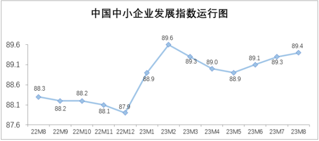 8月中國(guó)中小企業(yè)發(fā)展指數(shù)為89.4,比7月上升0.1點(diǎn),這是繼6月、7月分別上升0.2點(diǎn)之后,連續(xù)第三個(gè)月上升。