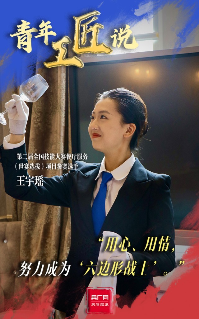370余個(gè)考核點(diǎn),對(duì)于第二屆全國(guó)技能大賽餐廳服務(wù)(世賽選拔)項(xiàng)目參賽選手王宇瑤來(lái)說(shuō),有著巨大的考驗(yàn)。但面對(duì)困難,王宇瑤始終保持微笑,在老師的指導(dǎo)下練習(xí)調(diào)制雞尾酒、餐巾折花、餐桌擺盤(pán)成百上千次。整齊的著裝、得體大方的儀容、神采奕奕的狀態(tài),一顰一笑皆為王宇瑤的細(xì)心巧思?!拔覍⒁源舜伪荣悶槠鯔C(jī),努力磨煉技藝,成為一名全面發(fā)展的‘六邊形戰(zhàn)士’?!蓖跤瞵幮χf(shuō)道。