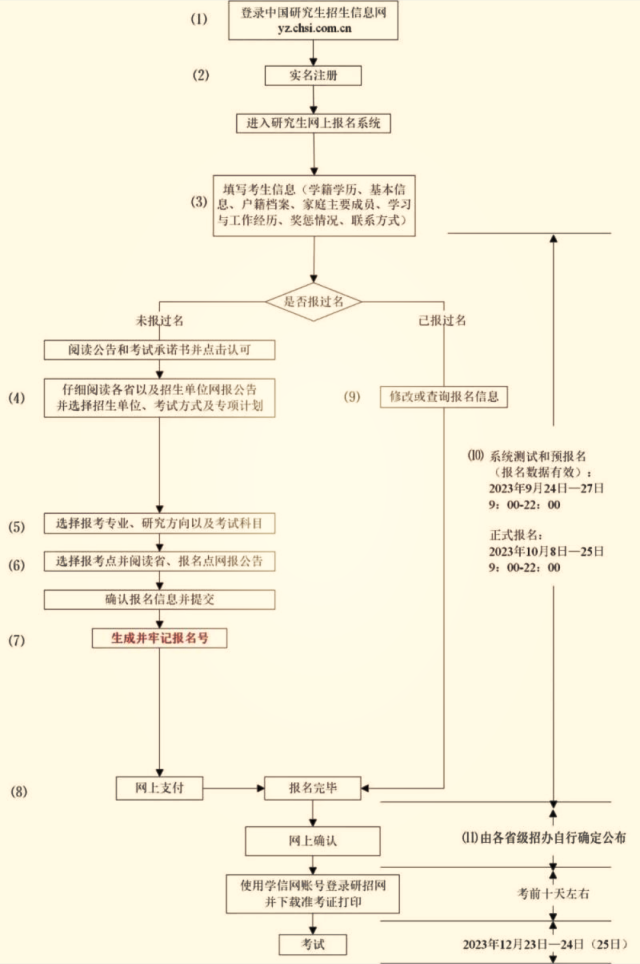 ?。?)考生應(yīng)在規(guī)定時(shí)間登錄“中國(guó)研究生招生信息網(wǎng)”(網(wǎng)址:https://yz.chsi.com.cn)瀏覽報(bào)考須知,并按省級(jí)教育招生考試機(jī)構(gòu)、報(bào)考點(diǎn)以及報(bào)考招生單位的網(wǎng)上公告要求報(bào)名;