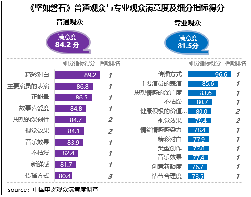 張藝謀導(dǎo)演新作《堅(jiān)如磐石》獲得觀眾滿(mǎn)意度評(píng)分84.1分,居2023年國(guó)慶檔調(diào)查五部影片首位,作為聚焦反腐反黑的警匪題材影片,對(duì)于社會(huì)現(xiàn)實(shí)以及人性的描摹深度和豐富層次得到了觀眾的高度好評(píng),思想性得分85.4分,為三大指數(shù)中最高,觀賞性得分84.4分,為檔期最高分,其中主要演員的表演得到了不同觀眾的高度評(píng)價(jià),在2023年調(diào)查的50部影片中分別居普通觀眾評(píng)價(jià)的第6位和專(zhuān)業(yè)觀眾評(píng)價(jià)的第3位。