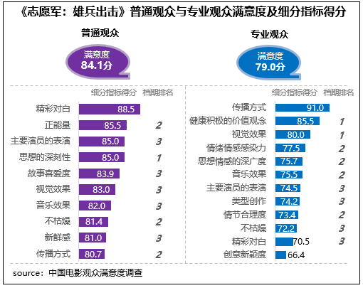 陳凱歌執(zhí)導(dǎo)的抗美援朝題材影片《志愿軍:雄兵出擊》觀眾滿(mǎn)意度83.8分,影片主題立意與國(guó)慶氛圍貼合,思想性得分85.0分,影片全景式呈現(xiàn)抗美援朝歷史,所傳遞的愛(ài)國(guó)精神和英雄氣概震撼人心,有85%的受訪觀眾表示在觀賞影片后感動(dòng)不已。