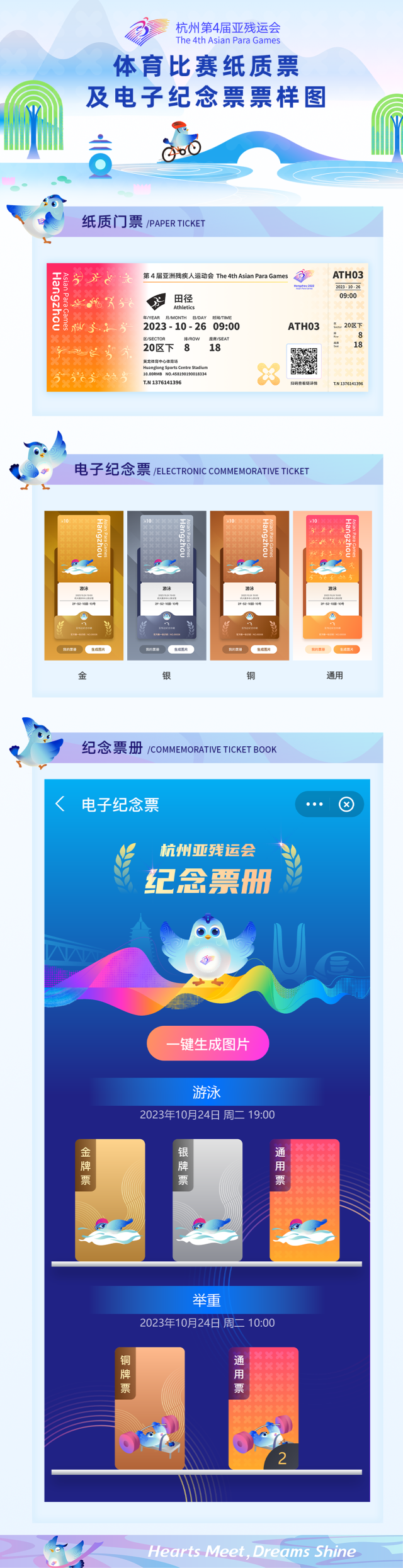 亞殘運(yùn)會(huì)日益受到廣大公眾密切關(guān)注,為回應(yīng)社會(huì)關(guān)切,經(jīng)研究,杭州亞殘組委決定采取亞殘運(yùn)會(huì)公眾售票官網(wǎng)選座購(gòu)票的銷(xiāo)售方式。具體票務(wù)信息可咨詢亞殘運(yùn)會(huì)公眾售票官網(wǎng)在線客服和票務(wù)官方咨詢熱線(400 909 2022)。 杭州亞殘組委發(fā)布體育比賽紙質(zhì)票及電子紀(jì)念票票樣設(shè)計(jì)圖。杭州第4屆亞洲殘疾人運(yùn)動(dòng)會(huì)體育比賽門(mén)票票面設(shè)計(jì)以“折桂”為主題,延續(xù)杭州亞運(yùn)會(huì)“映日紅”和“月桂黃”主色彩,輔以杭州亞殘運(yùn)會(huì)體育圖標(biāo),展現(xiàn)了亞殘運(yùn)會(huì)運(yùn)動(dòng)員奮勇拼搏的運(yùn)動(dòng)激情和勇立潮頭的時(shí)代精神。