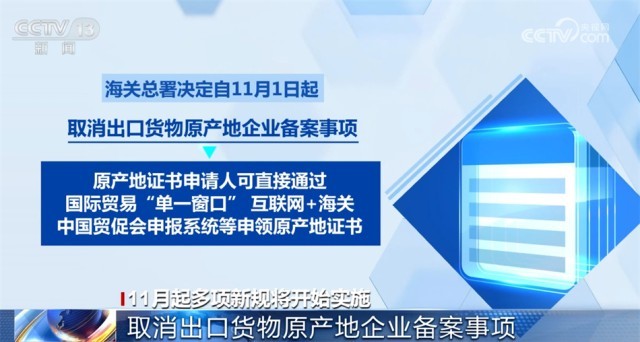 海關(guān)總署決定自11月1日起,取消出口貨物原產(chǎn)地企業(yè)備案事項(xiàng),原產(chǎn)地證書申請(qǐng)人可直接通過國(guó)際貿(mào)易“單一窗口”“互聯(lián)網(wǎng)+海關(guān)”、中國(guó)貿(mào)促會(huì)申報(bào)系統(tǒng)等申領(lǐng)原產(chǎn)地證書,進(jìn)一步優(yōu)化跨境貿(mào)易營(yíng)商環(huán)境,提升貿(mào)易便利。
