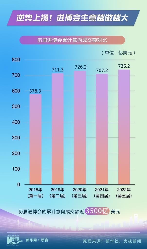 2018年11月,首屆進博會在上海“初試啼聲”。之后,進博會不顧風雨和險阻,年年如約而至、越辦越好。數(shù)據(jù)顯示,進博會的累計意向成交額從2018年的578.3億美元,上升到2022年的735.2億美元。前五屆進博會的累計意向成交額近3500億美元。進博會生意越做越大。