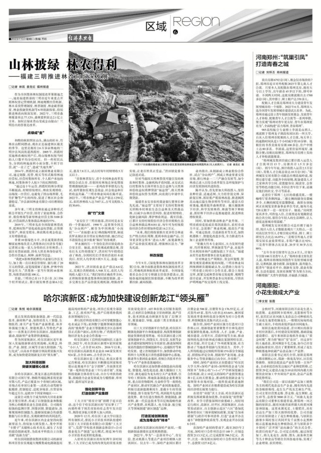 “首張林票發(fā)行、首個全國林業(yè)改革發(fā)展綜合試點市、首創(chuàng)國有林場差異化績效管理激勵機制……一系列改革舉措先行先試,始終緊扣實現(xiàn)生態(tài)效益、社會效益和百姓收益共贏?!比魇辛謽I(yè)局局長陳平說,2022年,三明市林業(yè)產(chǎn)業(yè)總產(chǎn)值達1258億元,農(nóng)民涉林收入達7107元,占可支配收入的30.6%。