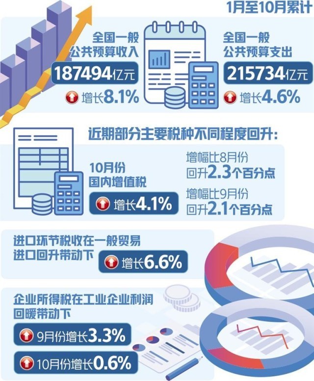 從稅收收入看,前10個(gè)月,全國(guó)稅收收入157841億元,同比增長(zhǎng)10.7%。值得關(guān)注的是,近期部分主要稅種不同程度回升,其中10月份國(guó)內(nèi)增值稅增長(zhǎng)4.1%,增幅比8月份、9月份分別回升2.3個(gè)、2.1個(gè)百分點(diǎn);進(jìn)口環(huán)節(jié)稅收在一般貿(mào)易進(jìn)口回升帶動(dòng)下,增長(zhǎng)6.6%;企業(yè)所得稅在工業(yè)企業(yè)利潤(rùn)回暖帶動(dòng)下,9月份、10月份分別增長(zhǎng)3.3%、0.6%。