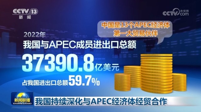 央視網(wǎng)消息(新聞聯(lián)播):商務(wù)部最新數(shù)據(jù)顯示,2022年,我國與APEC成員進出口總額為37390.8億美元,占我國進出口總額的59.7%。中國是13個APEC經(jīng)濟體的第一大貿(mào)易伙伴。