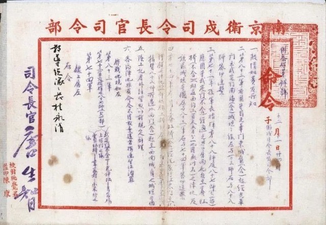 這是一份成文于1937年12月11日24時(shí),有關(guān)“死守南京”的作戰(zhàn)命令——“衛(wèi)參作第44號”命令。該命令由當(dāng)時(shí)南京衛(wèi)戍司令長官唐生智向教導(dǎo)總隊(duì)隊(duì)長桂永清下達(dá),右上方加蓋有“南京衛(wèi)戍司令長官關(guān)防”章。
