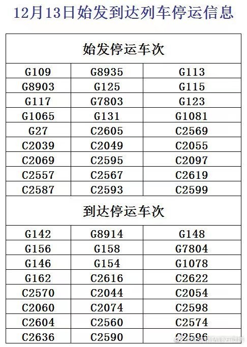 據(jù)北京西站官方微博今天中午最新消息,受降雪影響,12月13日,北京西站G57、G807、G97次列車臨時(shí)停運(yùn),北京豐臺站G63、G629次列車臨時(shí)停運(yùn)。今天早上,北京西站、北京豐臺站已發(fā)布部分停運(yùn)列車信息。已購買停運(yùn)列車車票的旅客,可于30日內(nèi)辦理全額退票手續(xù)。請廣大旅客合理安排出行,關(guān)注車站公告或12306網(wǎng)站信息。