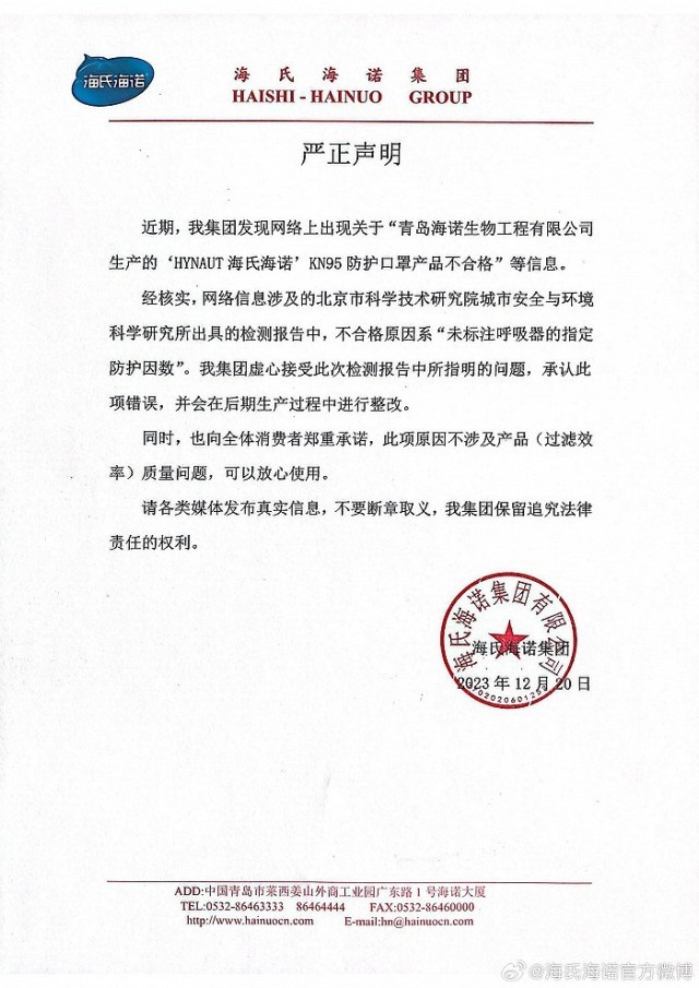 央視網(wǎng)消息:據(jù)海氏海諾官方微博發(fā)布聲明稱,近期,集團發(fā)現(xiàn)網(wǎng)絡上出現(xiàn)關于“青島海諾生物工程有限公司生產(chǎn)的‘HYNAUT 海氏海諾’KN95防護口罩產(chǎn)品不合格”等信息。經(jīng)核實,網(wǎng)絡信息涉及的北京市科學技術研究院城市安全與環(huán)境科學研究所出具的檢測報告中,不合格原因系“未標注呼吸器的指定防護因數(shù)”。海氏海諾表示,虛心接受此次檢測報告中所指明的問題,承認此項錯誤,并會在后期生產(chǎn)過程中進行整改。同時,海氏海諾承諾,此項原因不涉及產(chǎn)品(過濾效率)質(zhì)量問題,可以放心使用。
