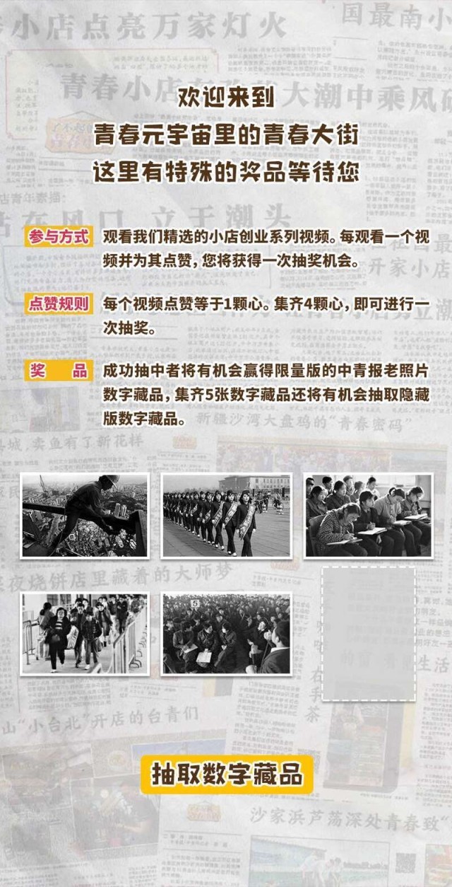 奔跑在青春大街上的青小豹邀請(qǐng)讀者一起玩尋找小店的游戲,大家可以邊體驗(yàn)邊觀看一個(gè)個(gè)小店和店主的故事,參加愛(ài)心點(diǎn)贊,還可以參與抽獎(jiǎng)。獎(jiǎng)品是用區(qū)塊鏈技術(shù)創(chuàng)制的數(shù)字藏品——改革開(kāi)放45年以來(lái)中國(guó)青年報(bào)拍攝的精彩照片。