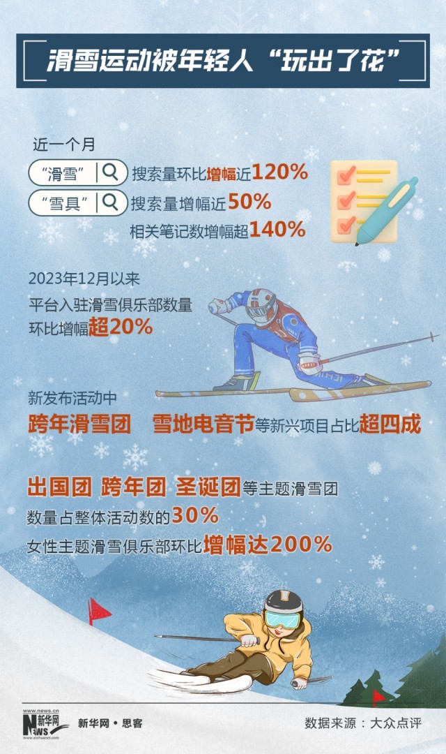 大眾點(diǎn)評(píng)數(shù)據(jù)顯示,2023年12月以來,滑雪俱樂部入駐數(shù)量環(huán)比增幅超20%。新發(fā)布活動(dòng)中,雪地電音節(jié)、滑雪旅行團(tuán)等新興項(xiàng)目占比超四成?!盎彼阉髁凯h(huán)比增幅近120%,“雪具”搜索量增幅近50%,相關(guān)筆記數(shù)增幅超140%。很多“95后”網(wǎng)友表示,自己一直都想滑雪,在網(wǎng)絡(luò)上看到一些“滑雪+電音節(jié)”的筆記攻略,被這種新穎的形式吸引,立刻“種草”。
