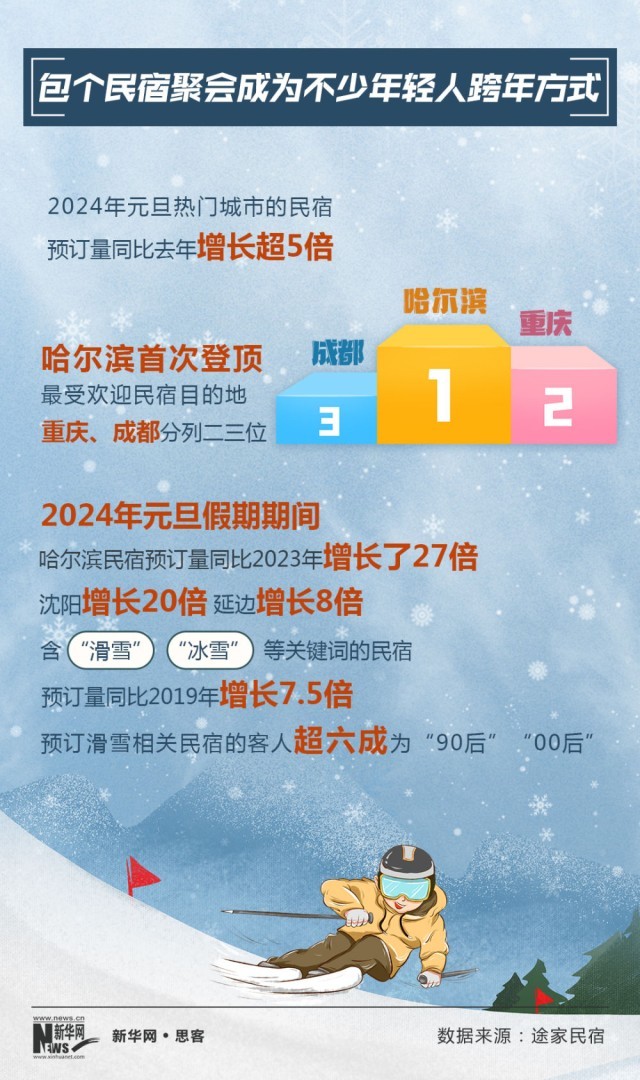 2024年元旦,民宿成為冰雪旅游一大熱詞。2024年元旦熱門城市的民宿,預(yù)訂量同比2023年增長超5倍。北方民宿更是強(qiáng)勢(shì)崛起,哈爾濱首次登頂最受歡迎民宿目的地。