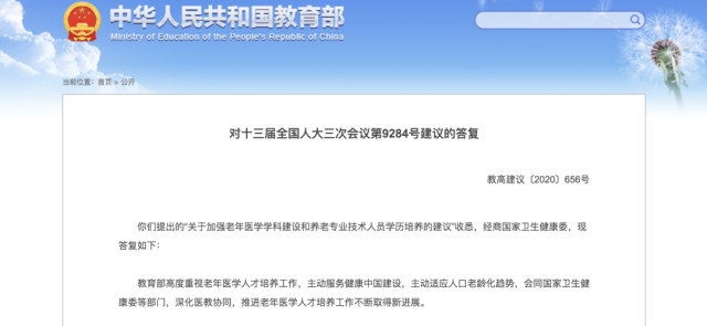 早在2021年,教育部官網(wǎng)曾公布《對十三屆全國人大三次會議第9284號建議的答復(fù)》,下一步,教育部將進(jìn)一步加強(qiáng)面向全體醫(yī)學(xué)類專業(yè)學(xué)生開展老年醫(yī)學(xué)教育,同時,協(xié)同國家衛(wèi)生健康委,鼓勵高校加強(qiáng)老年醫(yī)學(xué)學(xué)科建設(shè)、推進(jìn)老年醫(yī)學(xué)??漆t(yī)師規(guī)范化培訓(xùn)。