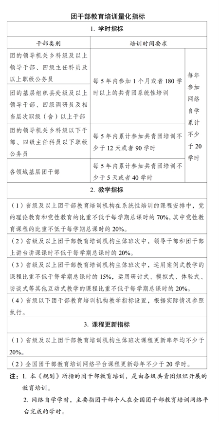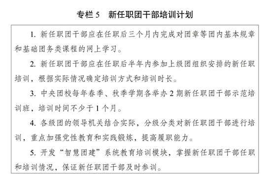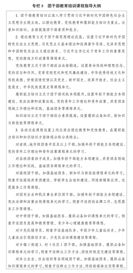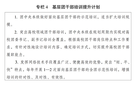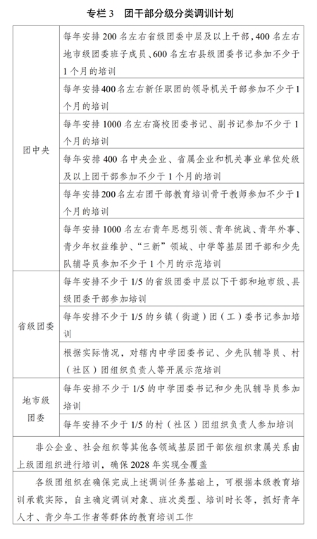 ?。ǘ﹫猿址旨壏诸?。根據(jù)各級團的領(lǐng)導(dǎo)機關(guān)干部、高校團干部、國有企業(yè)和機關(guān)事業(yè)單位單位團干部、中學(xué)團干部、鄉(xiāng)鎮(zhèn)(街道)團(工)委書記、村(社區(qū))團組織負責(zé)人、非公企業(yè)、社會組織等其他各領(lǐng)域基層團干部的不同對象特點,把團干部履職能力培訓(xùn)的普遍性要求與不同類別、不同層級、不同崗位團干部的特殊需要結(jié)合起來,整合優(yōu)質(zhì)資源,加強團干部教育培訓(xùn)機構(gòu)與黨校(行政學(xué)院)、干部學(xué)院、黨性教育基地等的合作聯(lián)動,多渠道多方面開展履職能力培訓(xùn),切實增強教育培訓(xùn)的時代性、系統(tǒng)性、針對性、有效性。發(fā)揮中央團校、全國青少年井岡山革命傳統(tǒng)教育基地主體作用,圍繞黨的中心任務(wù)、黨中央重大決策部署和國家重大戰(zhàn)略需求開展專題培訓(xùn);發(fā)揮全國團干部教育培訓(xùn)基地優(yōu)勢,開展政策解讀、重點任務(wù)落實等專題培訓(xùn);發(fā)揮地方團干部教育培訓(xùn)機構(gòu)優(yōu)勢,開展基層團干部實務(wù)培訓(xùn);發(fā)揮全國團干部教育培訓(xùn)網(wǎng)絡(luò)平臺作用,抓好履職通識培訓(xùn);加強與派出單位、接收單位的協(xié)作,抓好援派幫扶干部人才、掛職干部等教育培訓(xùn)。積極創(chuàng)造條件,支持干部在職自學(xué)。實施團干部分級分類調(diào)訓(xùn)計劃(專欄3)。