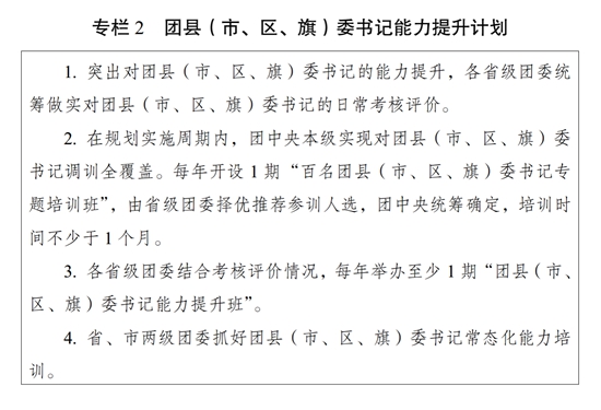 ?。ǘ┩怀觥瓣P(guān)鍵少數(shù)”政治訓(xùn)練。堅持把政治訓(xùn)練貫穿團干部成長全周期,使團干部的政治素養(yǎng)、政治能力與擔負的領(lǐng)導(dǎo)職責(zé)相匹配。強化“一把手”政治培訓(xùn),有計劃地選調(diào)團的各級領(lǐng)導(dǎo)機關(guān)主要負責(zé)同志到團干部教育培訓(xùn)機構(gòu)參加專題培訓(xùn)。強化對團縣(市、區(qū)、旗)委書記這一群體的培訓(xùn),實施團縣(市、區(qū)、旗)委書記能力提升計劃(專欄2)。突出對團的領(lǐng)導(dǎo)機關(guān)干部的政治訓(xùn)練,各級團的領(lǐng)導(dǎo)機關(guān)加強對機關(guān)干部的常態(tài)化政治能力培訓(xùn)。加強對青年人才的政治引領(lǐng),團中央組織部會同有關(guān)單位每年組織一定數(shù)量青年人才開展國情研修。積極推動將地方團的領(lǐng)導(dǎo)機關(guān)班子成員培訓(xùn)納入地方黨委組織開展的干部政治理論培訓(xùn)范疇。