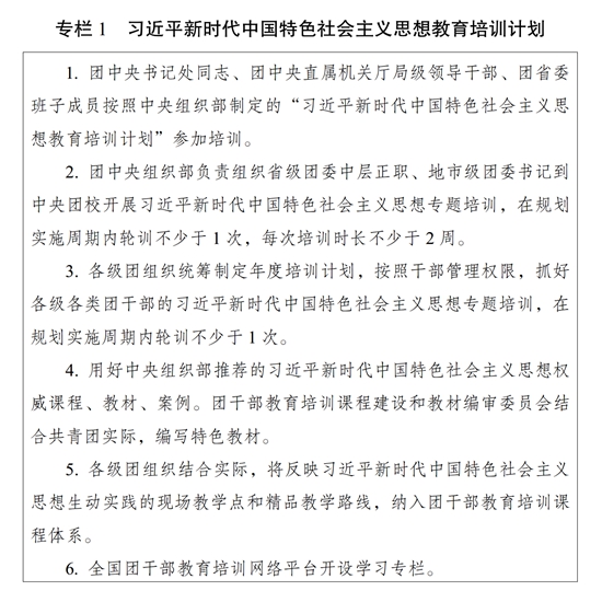?。ㄒ唬┚劢咕哿?,久久為功。完善團干部理論教育培訓(xùn)長效機制,落實黨的創(chuàng)新理論學(xué)習(xí)教育計劃,組織實施習(xí)近平新時代中國特色社會主義思想教育培訓(xùn)計劃(專欄1),系統(tǒng)謀劃、持續(xù)用力,不斷把思想鑄魂、理論武裝工作引向深入。堅持把習(xí)近平新時代中國特色社會主義思想作為團的各級領(lǐng)導(dǎo)機關(guān)班子成員理論學(xué)習(xí)中心組學(xué)習(xí)首要內(nèi)容,作出具體安排、精心組織實施;作為各級團干部教育培訓(xùn)機構(gòu)的主課必修課,辦好理論進修班、理論研修班;作為團干部學(xué)習(xí)的中心內(nèi)容,全面系統(tǒng)學(xué)、持續(xù)深入學(xué)、聯(lián)系實際學(xué)。以縣處級及以上團干部為重點,開展習(xí)近平新時代中國特色社會主義思想和黨的二十大精神集中輪訓(xùn);深入開展主題教育,通過專題學(xué)習(xí)、研討交流、主題黨課、調(diào)查研究、建章立制等形式,推動黨的創(chuàng)新理論學(xué)習(xí)教育走深走實走心,使廣大團干部更加深刻領(lǐng)悟“兩個確立”的決定性意義,更加自覺增強“四個意識”、堅定“四個自信”、做到“兩個維護”。深入開展習(xí)近平總書記關(guān)于青年工作的重要思想學(xué)習(xí)培訓(xùn),使廣大團干部學(xué)習(xí)掌握黨的青年工作的地位作用、目標任務(wù)、職責(zé)使命、實踐要求,為做好新時代新征程黨的青年工作打牢思想基礎(chǔ)。