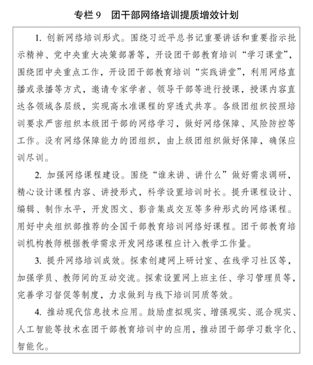?。ㄒ唬┚劢埂皣笳摺?。圍繞貫徹落實黨的二十大作出的重大戰(zhàn)略部署,分層級分領(lǐng)域開展以“國之大者”為主題的各類專題培訓(xùn),提高團干部推動高質(zhì)量發(fā)展本領(lǐng)、服務(wù)青年群眾本領(lǐng)、防范化解風(fēng)險本領(lǐng),提高團干部團結(jié)動員廣大團員青年積極投身中國式現(xiàn)代化建設(shè),在科技創(chuàng)新、鄉(xiāng)村振興、綠色發(fā)展、社會服務(wù)、衛(wèi)國戍邊等各領(lǐng)域各方面爭當排頭兵和生力軍的能力。堅持干什么學(xué)什么、缺什么補什么,加強與崗位職責(zé)相匹配的通識教育培訓(xùn),重點開展經(jīng)濟、政治、文化、社會、生態(tài)文明、黨的建設(shè)、憲法和法律法規(guī)等知識學(xué)習(xí)培訓(xùn),引導(dǎo)團干部及時填知識空白、補素質(zhì)短板、強能力弱項,提升團干部適應(yīng)新時代要求的專業(yè)化能力水平,掌握黨的青年工作理論和青年政策、青年群眾工作路徑方法等。加強信息技術(shù)、人工智能、生物技術(shù)、新能源、新材料等新知識新技能學(xué)習(xí)培訓(xùn),幫助團干部不斷開闊視野、提高綜合素養(yǎng)。