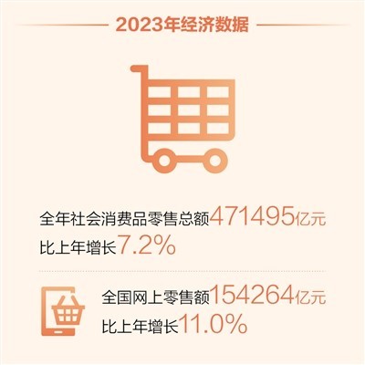 消費規(guī)模再創(chuàng)新高。2023年社會消費品零售總額達(dá)47.1萬億元,總量創(chuàng)歷史新高,比上年增長7.2%。按消費類型分,商品零售增長5.8%,餐飲收入增長20.4%。全國網(wǎng)上零售額154264億元,比上年增長11.0%;其中,實物商品網(wǎng)上零售額增長8.4%,占社會消費品零售總額的比重為27.6%。