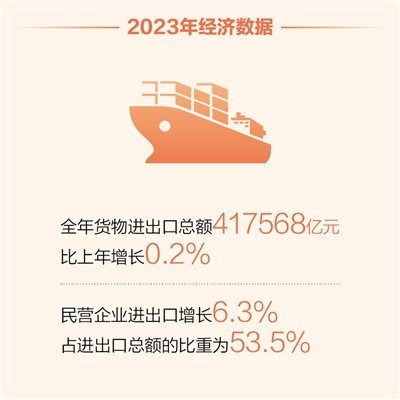 國際循環(huán)質(zhì)量和水平進(jìn)一步提升。面對外需收縮等不利影響,我國加力推動外貿(mào)穩(wěn)規(guī)模、優(yōu)結(jié)構(gòu),出口實現(xiàn)正增長,國際市場份額保持總體穩(wěn)定。同時,積極拓展國際經(jīng)貿(mào)合作,2023年我國對共建“一帶一路”國家進(jìn)出口總額比上年增長2.8%。