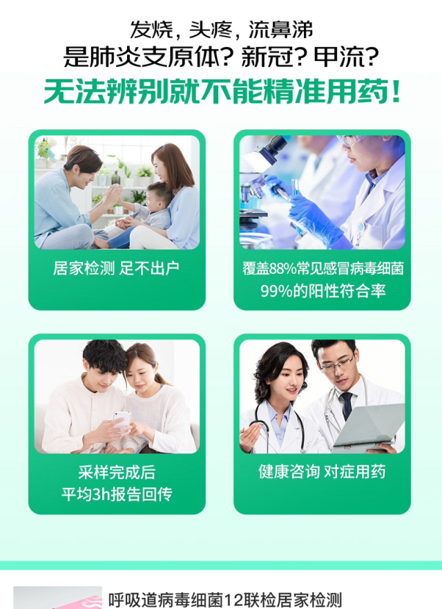 “一次檢測,覆蓋92種常見病原體和11種耐藥基因……”相比之下,有機構(gòu)推出的呼吸道病原體居家檢測似乎更加“高大上”。從介紹來看,檢測內(nèi)容包含甲流、乙流等30種RNA病毒、肺炎支原體等5種非典型病原體、煙曲霉等10種真菌、腺病毒等9種DNA病毒和百日咳鮑特菌等38種細菌,費用高達998元。