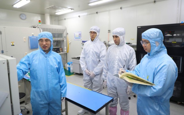 在位于沈陽市的中國科學(xué)院金屬研究所納米碳基電子器件超凈實(shí)驗(yàn)室,孫東明(左一)與指導(dǎo)的研究生一起討論反應(yīng)離子刻蝕工藝設(shè)備的使用方法和注意事項(xiàng)(2月24日攝)。