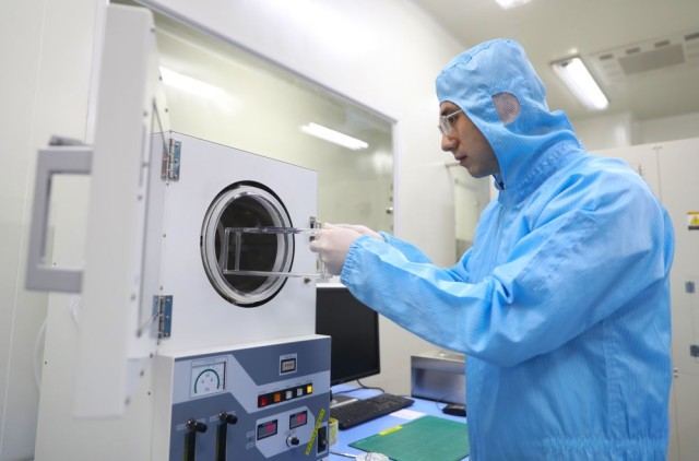 在位于沈陽市的中國科學(xué)院金屬研究所納米碳基電子器件超凈實(shí)驗(yàn)室,孫東明從前處理設(shè)備腔體中取出實(shí)驗(yàn)樣品(2月24日攝)。