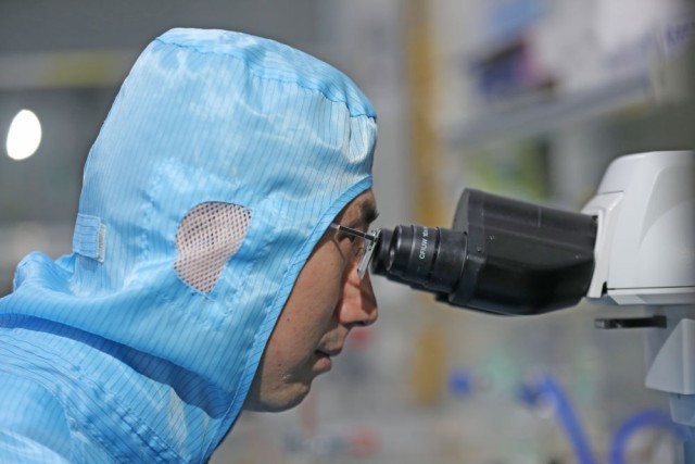在位于沈陽市的中國科學(xué)院金屬研究所納米碳基電子器件超凈實(shí)驗(yàn)室,孫東明在聚焦光學(xué)顯微鏡前觀測實(shí)驗(yàn)樣品的形貌(2月24日攝)。