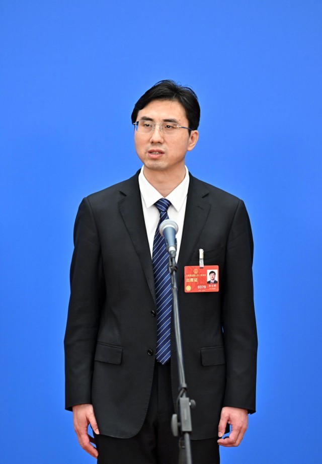 在第十四屆全國人民代表大會一次會議舉行的第二場“代表通道”采訪活動(dòng)上,孫東明接受媒體采訪(2023年3月7日攝)。新華社記者 李鑫 攝