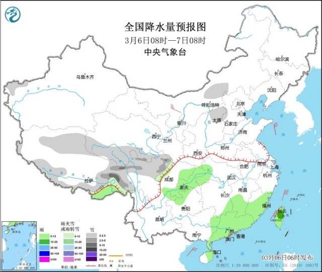 3月6日08時(shí)至7日08時(shí),西藏東部和南部、青海南部、川西高原北部、山西北部等地部分地區(qū)有小雪或雨夾雪,其中,西藏東部、川西高原北部等地部分地區(qū)有中到大雪。江南東部和南部、西南地區(qū)東部、華南中東部、臺(tái)灣島等地部分地區(qū)有小雨,其中,臺(tái)灣島北部等地部分地區(qū)有中雨。內(nèi)蒙古西北部部分地區(qū)有4~5級(jí)風(fēng)(見圖1)。