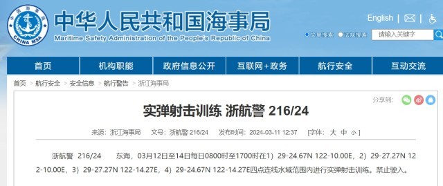 央視網(wǎng)消息:據(jù)中國海事局網(wǎng)站消息,浙江海事局發(fā)布航行警告,3月12日至14日每日8時至17時,東海部分水域進行實彈射擊訓(xùn)練,禁止駛?cè)搿?/p>