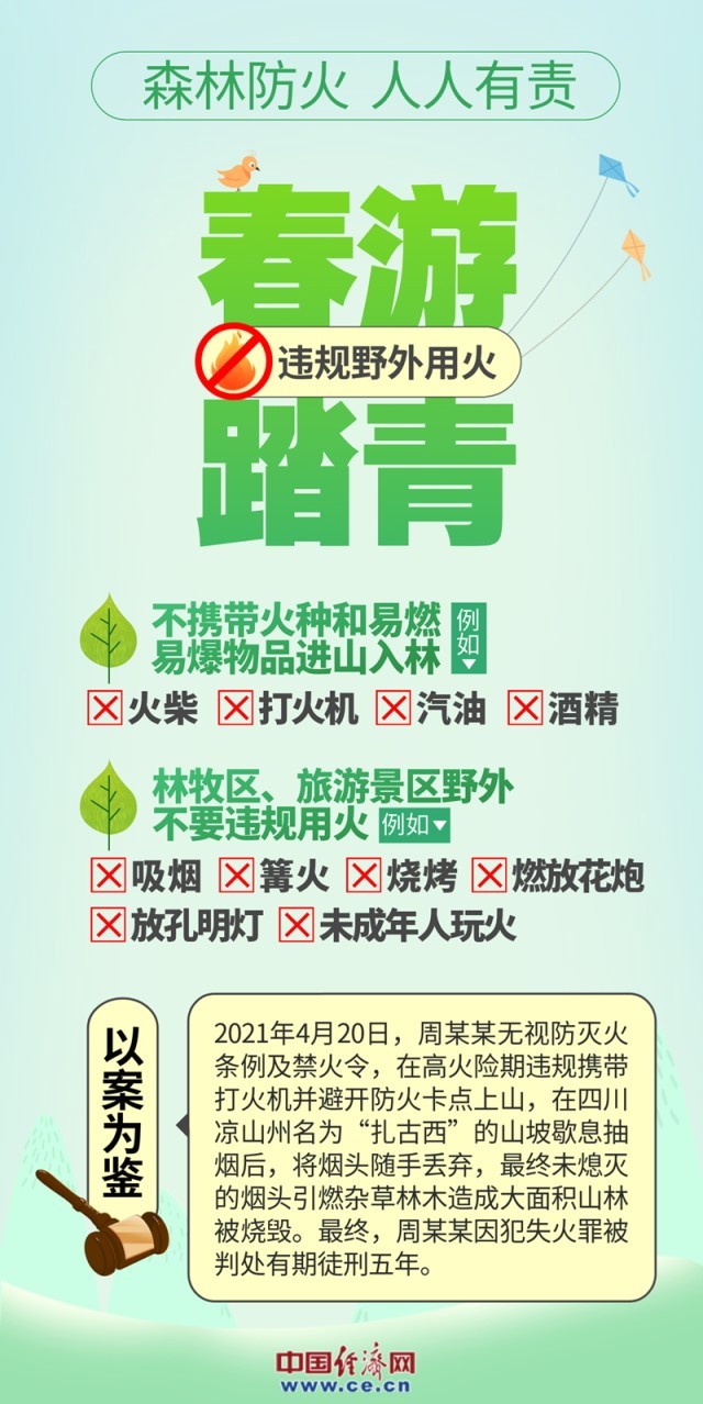 數(shù)據(jù)顯示,超九成的森林火災(zāi)都是由人為因素引發(fā)。全面加強(qiáng)森林防火工作,確保森林資源和生態(tài)環(huán)境的安全,是每個(gè)公民的責(zé)任。希望全社會(huì)增強(qiáng)護(hù)林防火意識(shí),牢記森林防火“十不要”,從我做起,從小事做起,共同守護(hù)綠色家園。