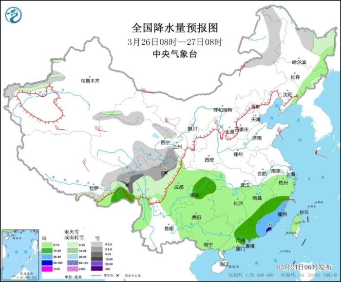 3月26日08時(shí)至27日08時(shí),內(nèi)蒙古東部、黑龍江北部、西藏東部、青海北部和南部、甘肅河西和西南部、川西高原北部等地的部分地區(qū)有小到中雪或雨夾雪,其中,西藏東部等地部分地區(qū)有大雪(5~9毫米)。西藏東南部、江西東南部、浙江南部、福建、廣東中東部、重慶中部等地的部分地區(qū)有中到大雨,其中,福建東南部、廣東東部等地局地暴雨(50~70毫米)。內(nèi)蒙古中西部、西藏北部、甘肅河西、山西中部等地的部分地區(qū)有4~6級(jí)風(fēng),其中新疆南疆盆地的部分地區(qū)有6~7級(jí)風(fēng)(見圖4)。
