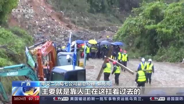 總臺(tái)央視記者 王世玉:我現(xiàn)在的位置是廣西梧州藤縣莫埌村的入口,也是通往事故核心區(qū)的一條必經(jīng)之路。大家看到在我身后的貨車正在進(jìn)行物資的裝卸,裝卸的物資是竹排。為什么要進(jìn)行竹排的運(yùn)輸呢?因?yàn)?現(xiàn)場(chǎng))從昨天晚上開(kāi)始就一直在降雨,可以看到路面非常泥濘,在核心區(qū)內(nèi)通行更是非常困難。施工人員想到用竹排鋪滿在路面上,方便物資和人員的運(yùn)輸和通行。