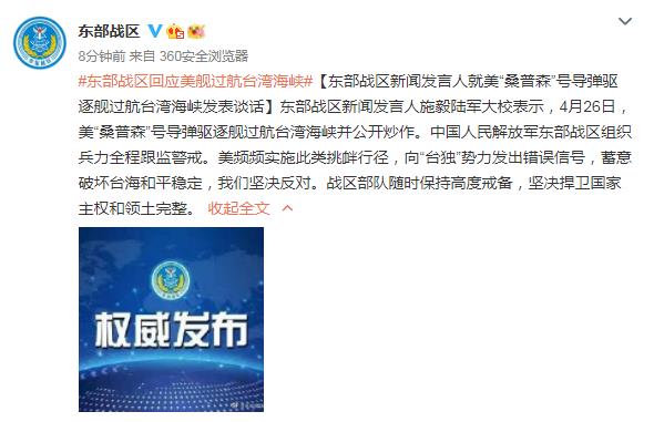 中新網(wǎng)4月27日電 據(jù)中國(guó)人民解放軍東部戰(zhàn)區(qū)官方微博消息,東部戰(zhàn)區(qū)新聞發(fā)言人27日就美“桑普森”號(hào)導(dǎo)彈驅(qū)逐艦過(guò)航臺(tái)灣海峽發(fā)表談話。東部戰(zhàn)區(qū)新聞發(fā)言人施毅陸軍大校表示,4月26日,美“桑普森”號(hào)導(dǎo)彈驅(qū)逐艦過(guò)航臺(tái)灣海峽并公開(kāi)炒作。中國(guó)人民解放軍東部戰(zhàn)區(qū)組織兵力全程跟監(jiān)警戒。美頻頻實(shí)施此類挑釁行徑,向“臺(tái)獨(dú)”勢(shì)力發(fā)出錯(cuò)誤信號(hào),蓄意破壞臺(tái)海和平穩(wěn)定,我們堅(jiān)決反對(duì)。戰(zhàn)區(qū)部隊(duì)隨時(shí)保持高度戒備,堅(jiān)決捍衛(wèi)國(guó)家主權(quán)和領(lǐng)土完整。