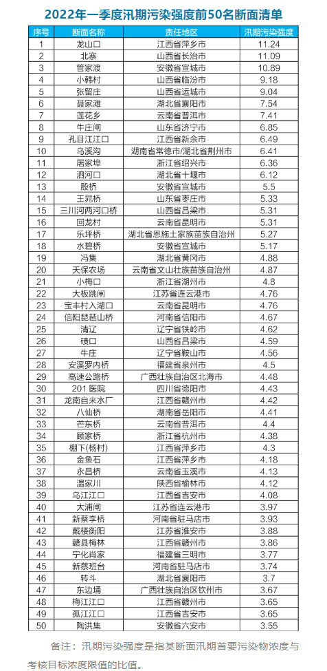 扣除自然因素影響,全國(guó)25個(gè)劣Ⅴ類(lèi)斷面分布在12個(gè)省份。其中,云南省數(shù)量最多,為7個(gè)。22個(gè)水質(zhì)明顯惡化斷面分布在13個(gè)省份。其中,安徽省數(shù)量最多,為4個(gè)。全國(guó)汛期污染強(qiáng)度較大的前50個(gè)斷面分布在15個(gè)省份,江西、湖北、云南省數(shù)量較多,占比為42.0%。其中,江西省萍鄉(xiāng)市龍山口斷面、山西省長(zhǎng)治市北寨斷面、安徽省宣城市管家渡斷面汛期污染強(qiáng)度位于全國(guó)前三名。