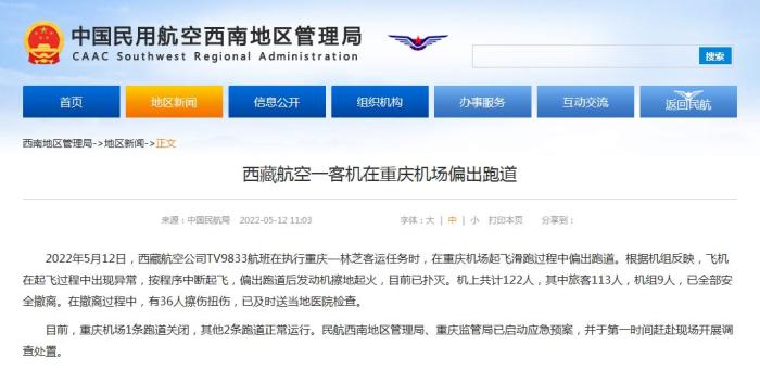 中新網(wǎng)5月12日電 據(jù)民航局網(wǎng)站消息,民航局今日就西藏航空一客機(jī)在重慶機(jī)場(chǎng)偏出跑道發(fā)布通報(bào)。通報(bào)稱,2022年5月12日,西藏航空公司TV9833航班在執(zhí)行重慶—林芝客運(yùn)任務(wù)時(shí),在重慶機(jī)場(chǎng)起飛滑跑過(guò)程中偏出跑道。根據(jù)機(jī)組反映,飛機(jī)在起飛過(guò)程中出現(xiàn)異常,按程序中斷起飛,偏出跑道后發(fā)動(dòng)機(jī)擦地起火,目前已撲滅。機(jī)上共計(jì)122人,其中旅客113人,機(jī)組9人,已全部安全撤離。在撤離過(guò)程中,有36人擦傷扭傷,已及時(shí)送當(dāng)?shù)蒯t(yī)院檢查。