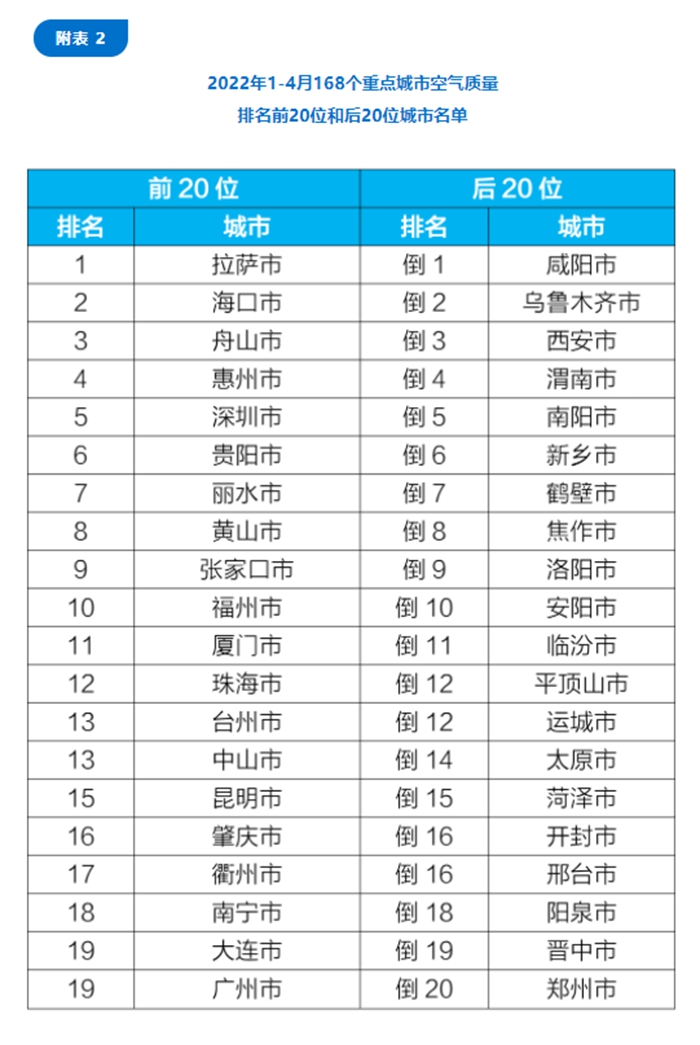 1—4月,168個重點城市中,拉薩、??诤椭凵绞械?0個城市空氣質(zhì)量相對較好;咸陽、烏魯木齊和西安市等20個城市空氣質(zhì)量相對較差。(完)