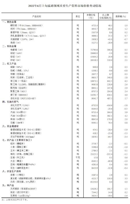 2022年6月上旬流通領(lǐng)域重要生產(chǎn)資料市場價(jià)格變動(dòng)情況。國家統(tǒng)計(jì)局網(wǎng)站截圖