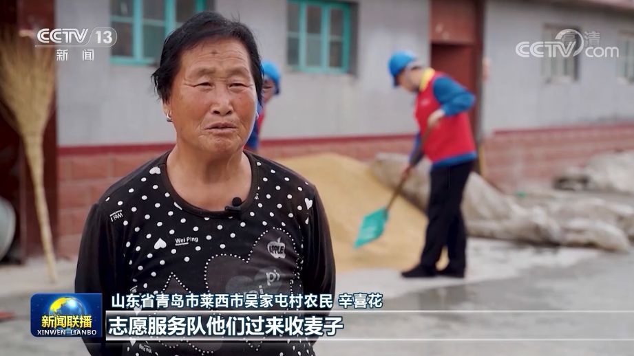 在山東萊西,66萬(wàn)多畝小麥進(jìn)入集中收獲期,當(dāng)?shù)?0多家社會(huì)化服務(wù)組織和志愿服務(wù)隊(duì)活躍在麥?zhǔn)找痪€(xiàn)。吳家屯村農(nóng)民辛喜花的孩子在外打工,在志愿服務(wù)隊(duì)幫助下,她家3畝多小麥不到一小時(shí)就收獲完成運(yùn)送到家。