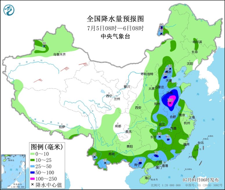 7月5日08時至6日08時,內(nèi)蒙古中東部、京津冀、黃淮中東部、西南地區(qū)南部、江淮大部、江漢東部、江南中東部、華南大部、臺灣島等地的部分地區(qū)有中到大雨,其中,山東中南部、河南東部、安徽北部、江蘇北部、京津冀、廣東北部等地的部分地區(qū)有暴雨,山東南部、安徽北部、江蘇北部、河南東部等地局地大暴雨(100~180毫米)。新疆北部和東部、內(nèi)蒙古西部、甘肅西部、東北地區(qū)南部、山東半島、江南東部等地的部分地區(qū)有4~6級風(fēng),其中,新疆東部、浙江東部等地的部分地區(qū)風(fēng)力可達(dá)7級以上;東海大部海域、臺灣海峽、北部灣有5~6級、陣風(fēng)7級的偏南到西南風(fēng)。