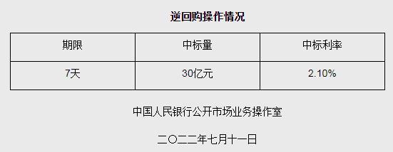 中新網(wǎng)7月11日電 據(jù)中國人民銀行網(wǎng)站消息,為維護(hù)銀行體系流動(dòng)性合理充裕,2022年7月11日人民銀行以利率招標(biāo)方式開展了30億元逆回購操作,中標(biāo)利率2.10%。(中新財(cái)經(jīng))