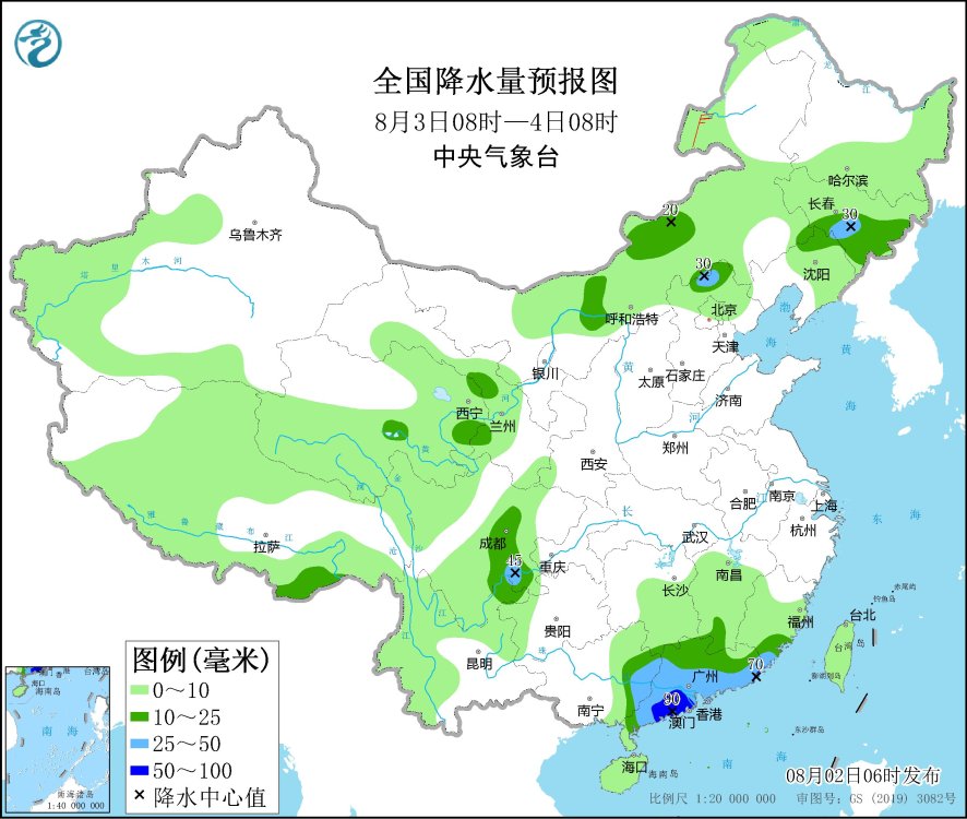 8月3日08時至4日08時,內蒙古中部、河北北部、吉林東部、遼寧北部、四川盆地西部和南部、廣西東部、廣東大部、福建東南部等地部分地區(qū)有中到大雨,其中,廣東西南部和東部沿海等地部分地區(qū)有暴雨(50~90毫米)。內蒙古東北部部分地區(qū)有4~5級風。