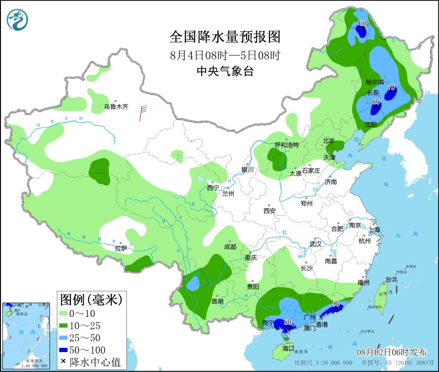 8月4日08時至5日08時,內蒙古東北部、東北地區(qū)大部、四川南部、云南中部和西北部、廣西大部、廣東大部等地有中到大雨,其中,內蒙古東北部、黑龍江西北部和東南部、吉林中部、遼寧北部、廣西東南部沿海、廣東西南部和東部沿海等地部分地區(qū)有暴雨(50~90毫米)。黑龍江西北部部分地區(qū)有4~6級風。