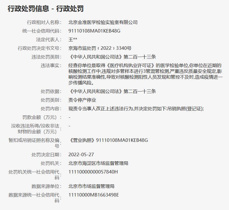 據(jù)信用中國(北京)網(wǎng)站5月31日行政處罰信息顯示,北京金準(zhǔn)醫(yī)學(xué)檢驗實驗室有限公司在近期的核酸檢測工作中,違規(guī)對多管樣本進行3管混管檢測,嚴(yán)重違反質(zhì)量安全規(guī)定,影響檢測結(jié)果準(zhǔn)確性,導(dǎo)致對核酸檢測陽性人員發(fā)現(xiàn)和管控不及時,造成疫情進一步傳播風(fēng)險。北京市海淀區(qū)市場監(jiān)督管理局決定吊銷其執(zhí)照(登記證)。(中新財經(jīng))