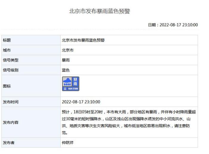 中新網(wǎng)8月17日電 據(jù)北京氣象局網(wǎng)站消息,8月17日23時10分,北京市氣象局發(fā)布暴雨藍色預警。